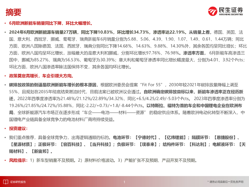 民生证券:EV观察系列167:6月欧洲新能车市场同比下降,单月渗透率环比略微提升.pdf