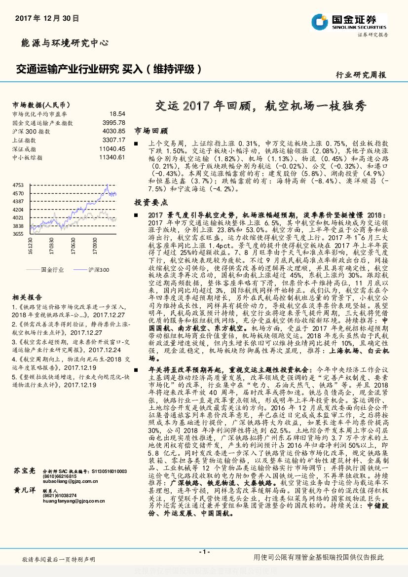 国金证券:交通运输产业行业研究周报:交运2017年回顾,航空机场一枝独秀.pdf