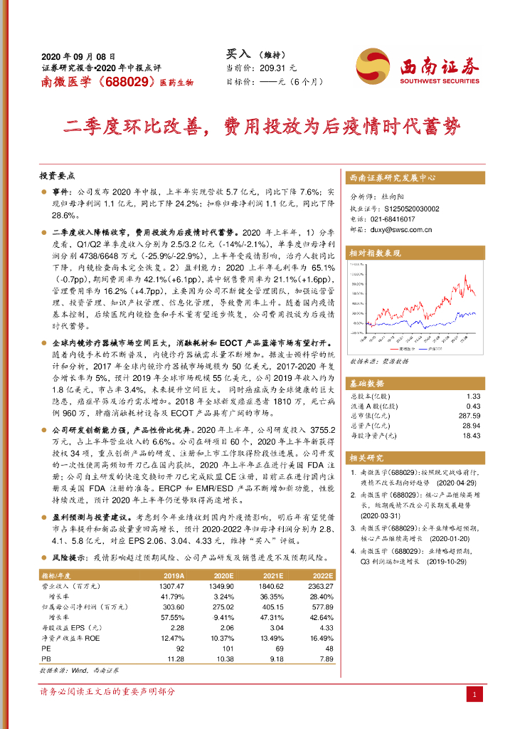 西南证券:南微医学(688029)-二季度环比改善,费用投放为后疫情时代蓄势.pdf