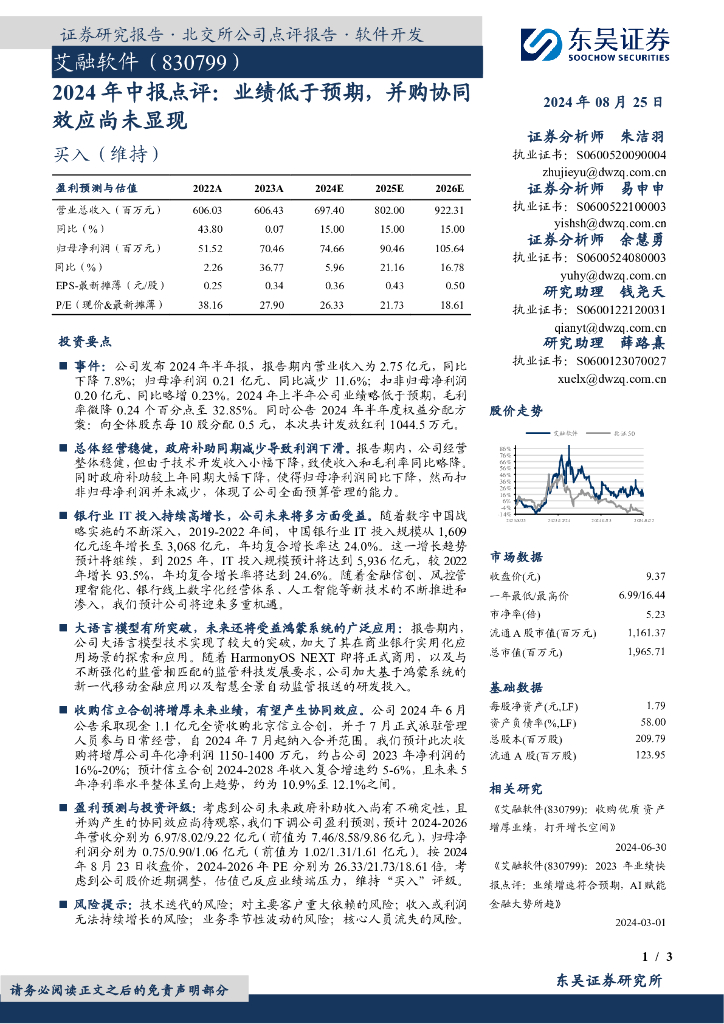 东吴证券:艾融软件(830799)-2024年中报点评:业绩低于预期,并购协同效应尚未显现.pdf