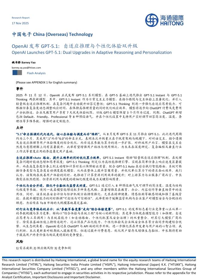 海通国际:中国电子:OpenAI发布GPT-5.1:自适应推理与个性化体验双升级.pdf