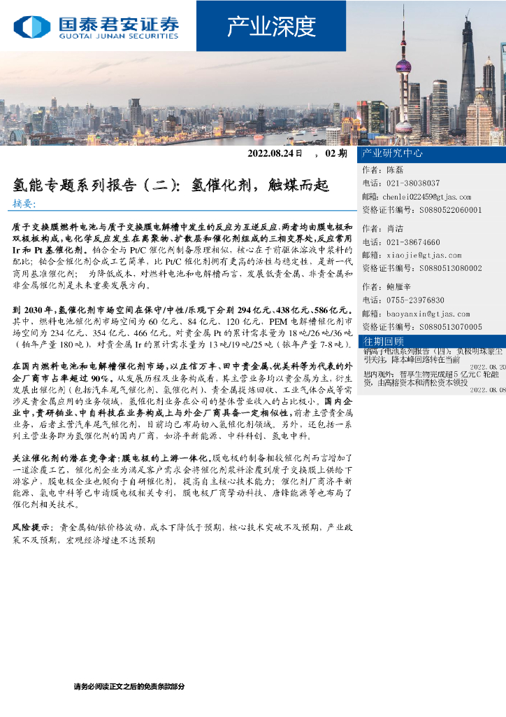 国泰君安:产业深度:氢能专题系列报告(二),氢催化剂,触媒而起.pdf