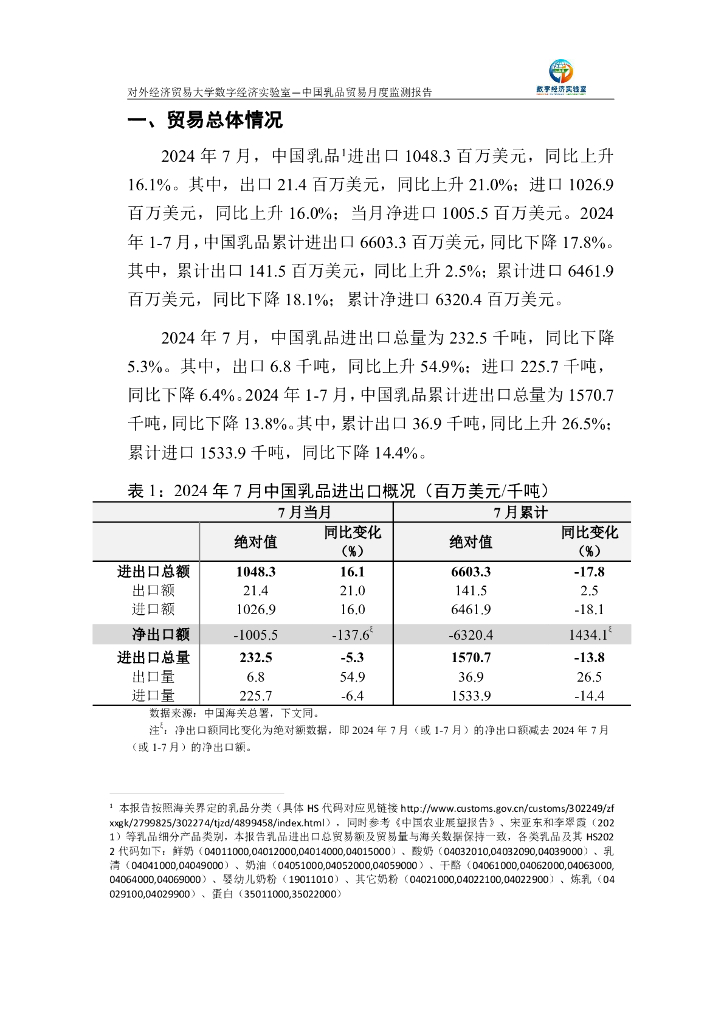 对外经济贸易大学:中国乳品贸易月度监测报告(2024年1-7月).pdf