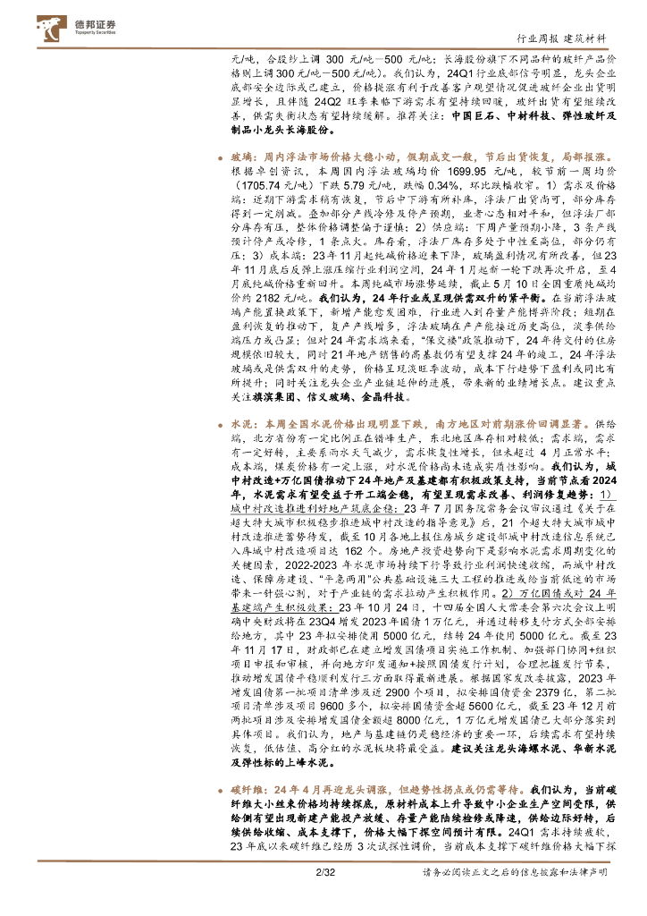 德邦证券:建筑材料行业周观点:地产链可以乐观点,玻纤持续提价Q2弹性显现.pdf