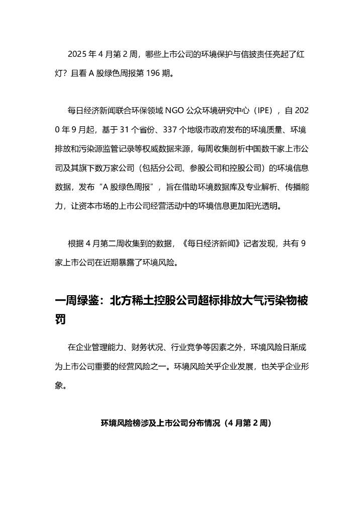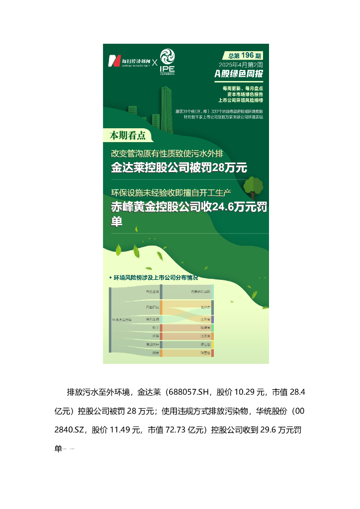 A股绿色周报(2025年4月第2周 总第196期):9家上市公司暴露环境风险 金达莱控股公司被罚28万元.pdf