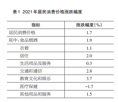 全年居民消费价格比上年上涨1.7%,其中,食品烟酒价格上涨1.9%。商品零售价格上涨1.4%。新建商品住宅销售价格上涨7.5%,二手住宅销售价格上涨6.3%。