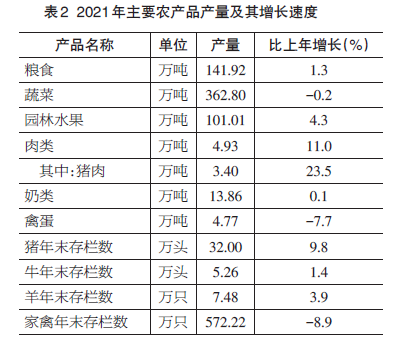 全年粮食产量141.92万吨,比上年增长1.3%,其中,夏粮产量72.34万吨,增长2.5%;秋粮产量69.58万吨,增长0.1%。肉类产量4.93万吨,增长11.0%;奶类产量13.86万吨,增长0.1%;禽蛋产量4.77万吨,下降7.7%;蔬菜产量362.80万吨,下降0.2%;园林水果产量101.01万吨,增长4.3%。