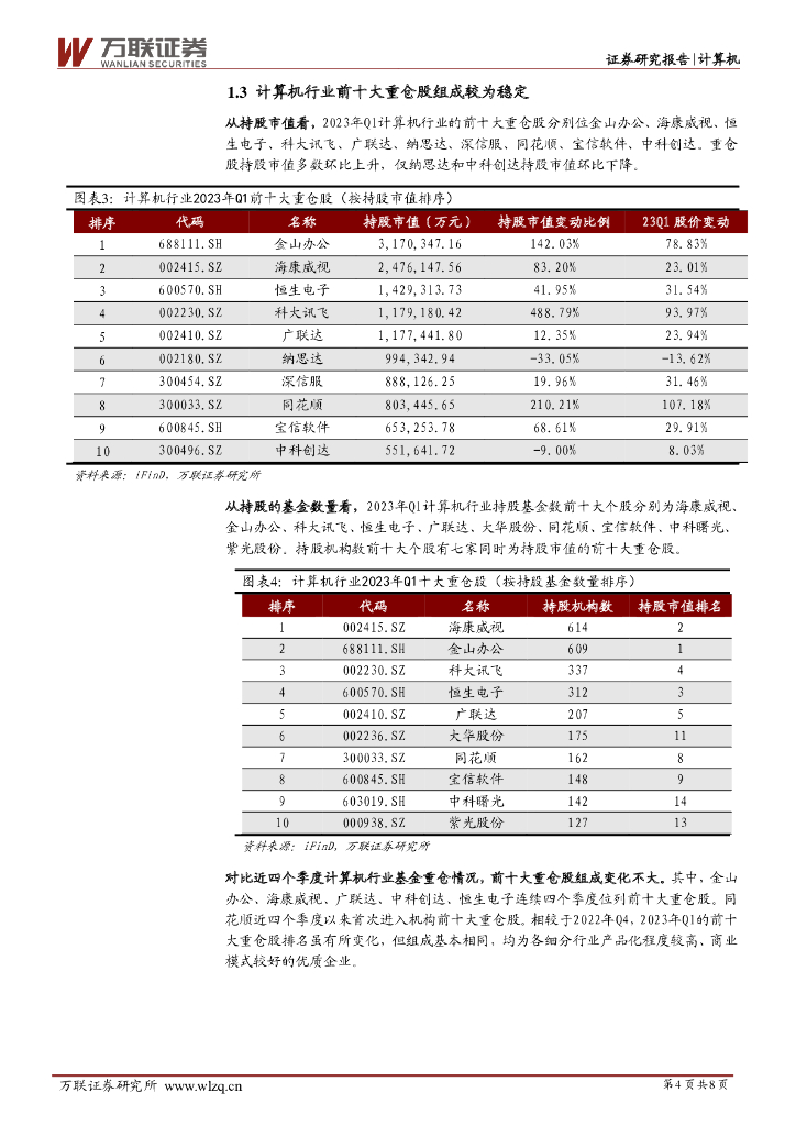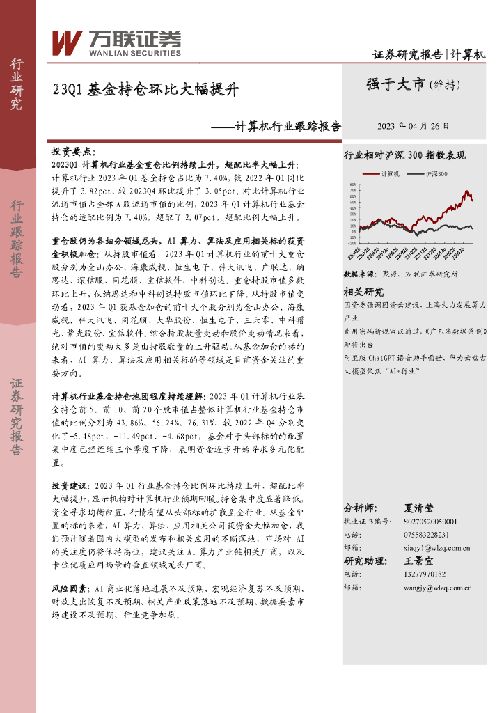 万联证券:计算机行业跟踪报告:23Q1基金持仓环比大幅提升.pdf