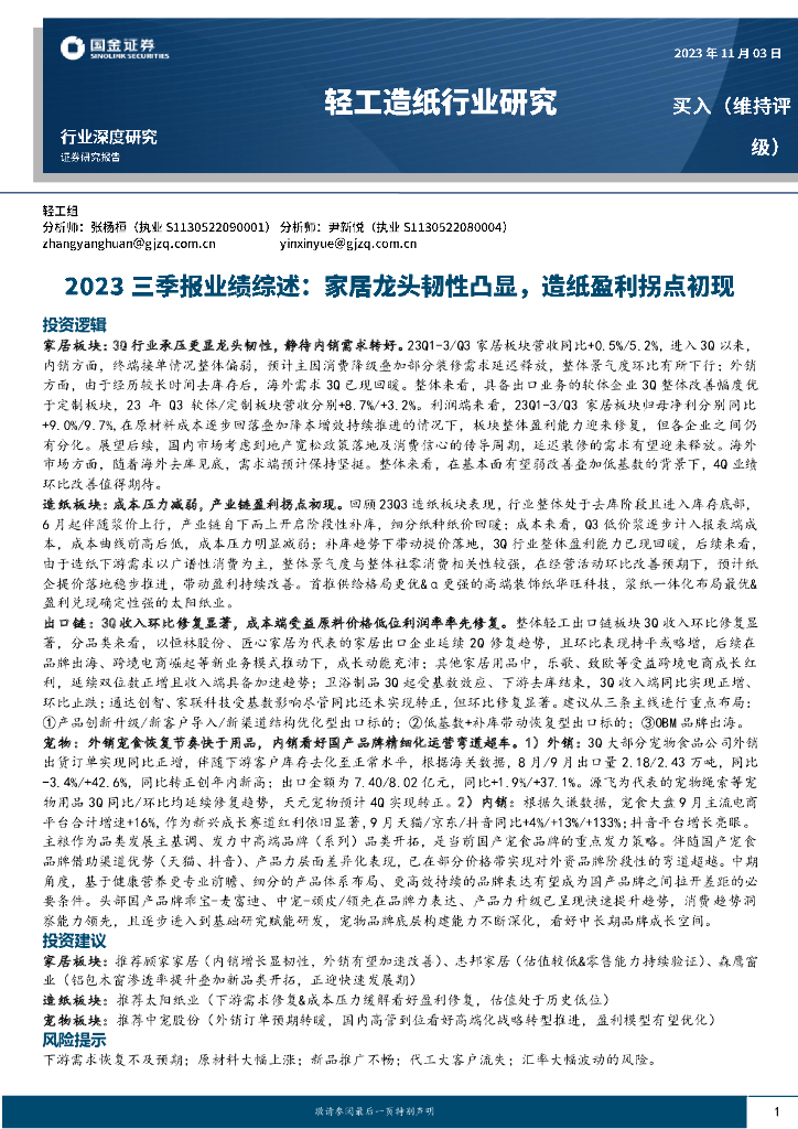 国金证券:轻工造纸行业研究:2023三季报业绩综述:家居龙头韧性凸显,造纸盈利拐点初现.pdf