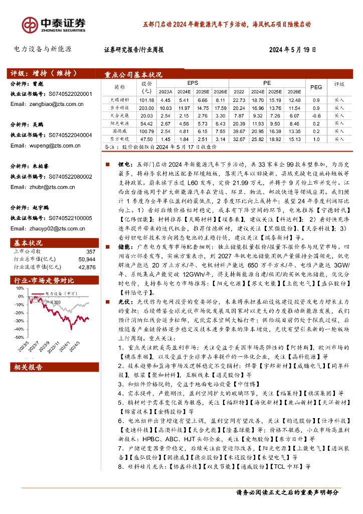 中泰证券:电力设备与新能源行业周报:五部门启动2024年新能源汽车下乡活动,海风帆石项目陆续启动.pdf
