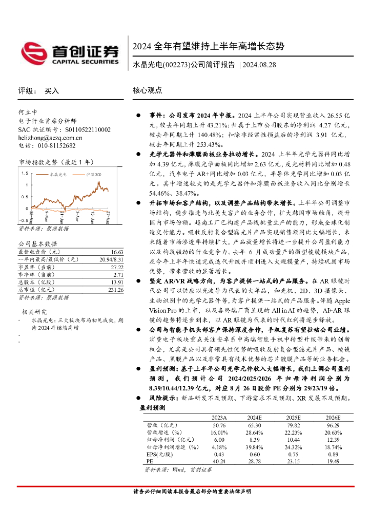 首创证券:水晶光电(002273)-公司简评报告:2024全年有望维持上半年高增长态势.pdf