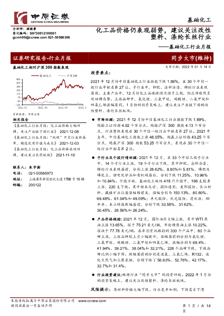中原证券:基础化工行业月报:化工品价格仍表现弱势,建议关注改性塑料、涤纶长丝行业.pdf