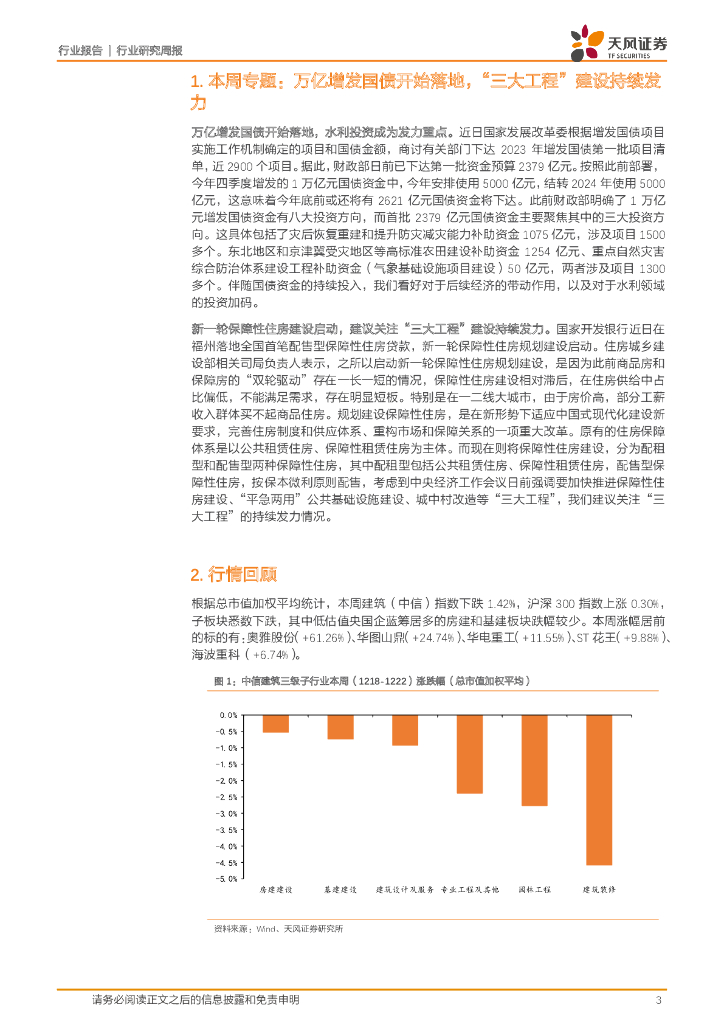 天风证券:建筑装饰行业研究周报:万亿增发国债开始落地,“三大工程”建设持续发力.pdf