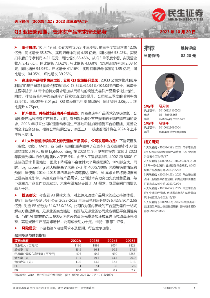 民生证券:天孚通信(300394)-2023年三季报点评:Q3业绩超预期,高速率产品需求增长显著.pdf