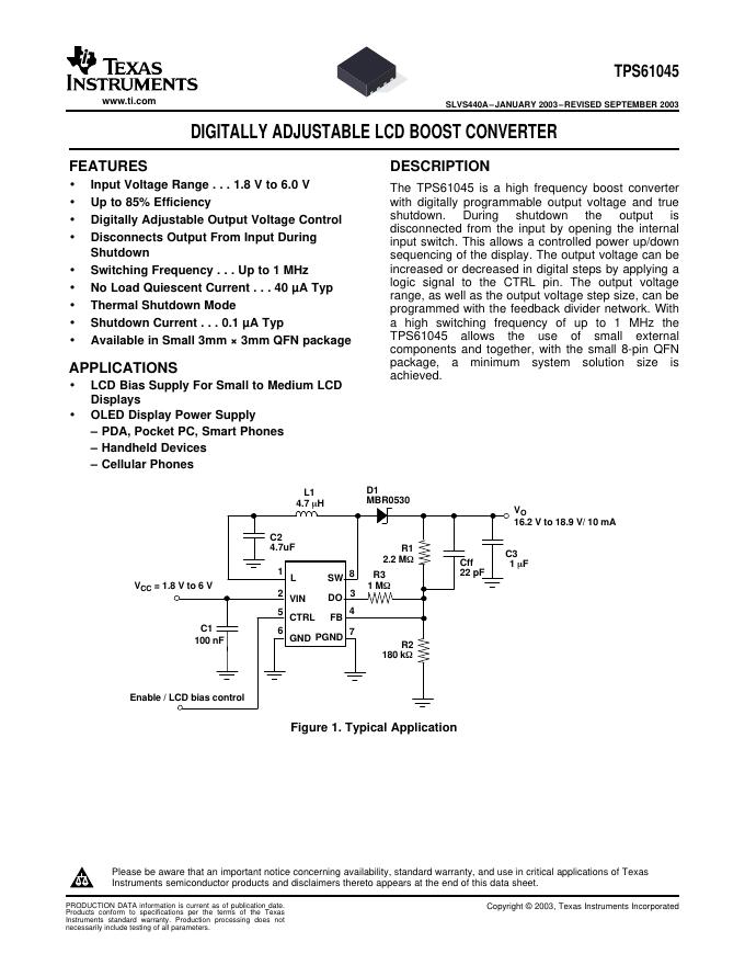 TEXAS INSTRUMENTS TPS61045 DIGITALLY ADJUSTABLE LCD BOOST CONVERTER数据手册.pdf