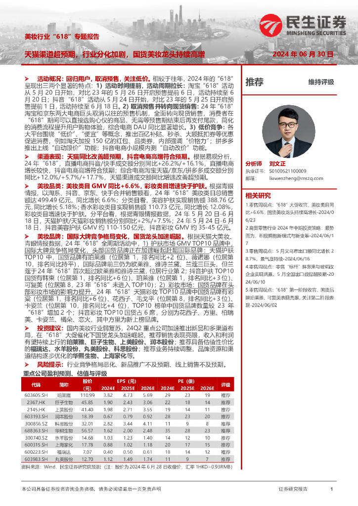 民生证券:美妆行业“618”专题报告:天猫渠道超预期,行业分化加剧,国货美妆龙头持续高增.pdf