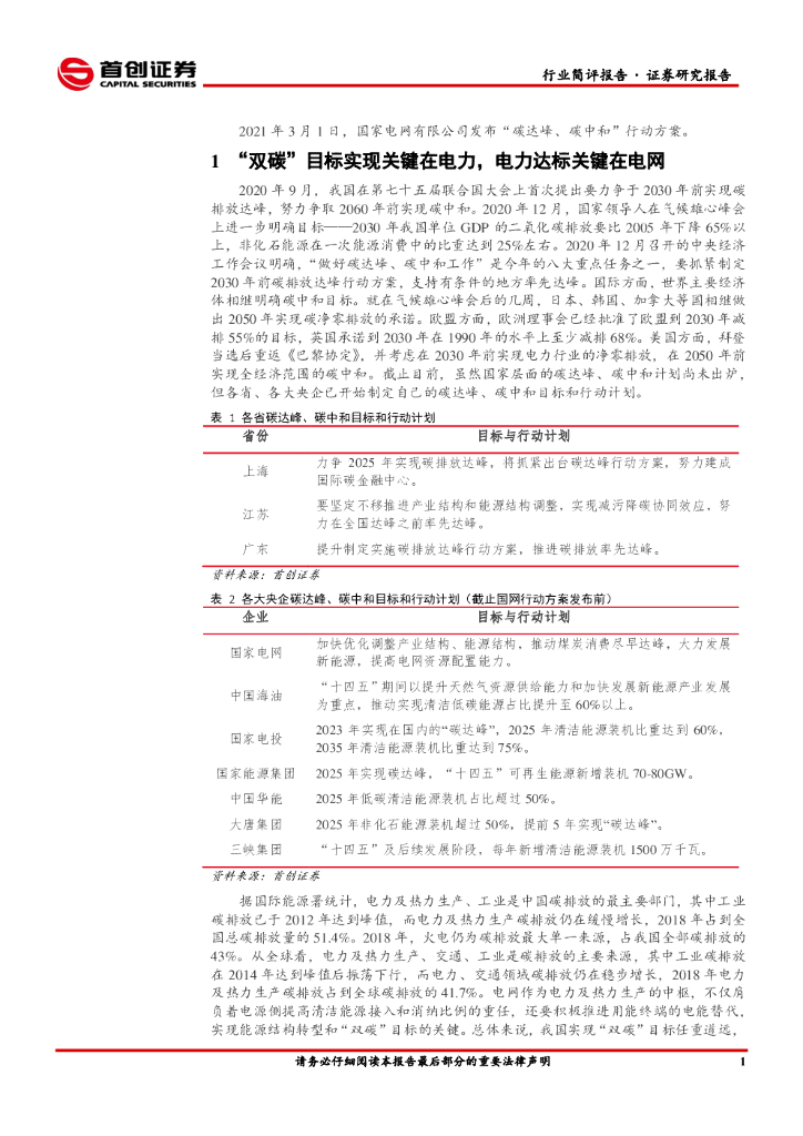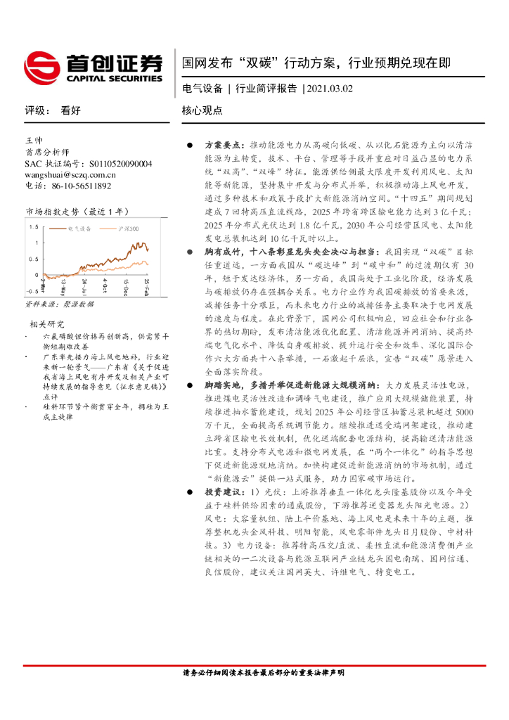 首创证券:电气设备行业简评报告:国网发布“双碳”行动方案,行业预期兑现在即.pdf