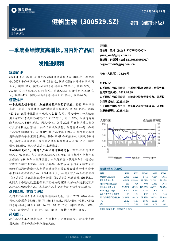 国金证券:健帆生物(300529)-一季度业绩恢复高增长,国内外产品研发推进顺利.pdf