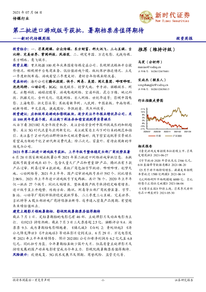 新时代证券:新时代传媒周报:第二批进口游戏版号获批,暑期档票房值得期待.pdf