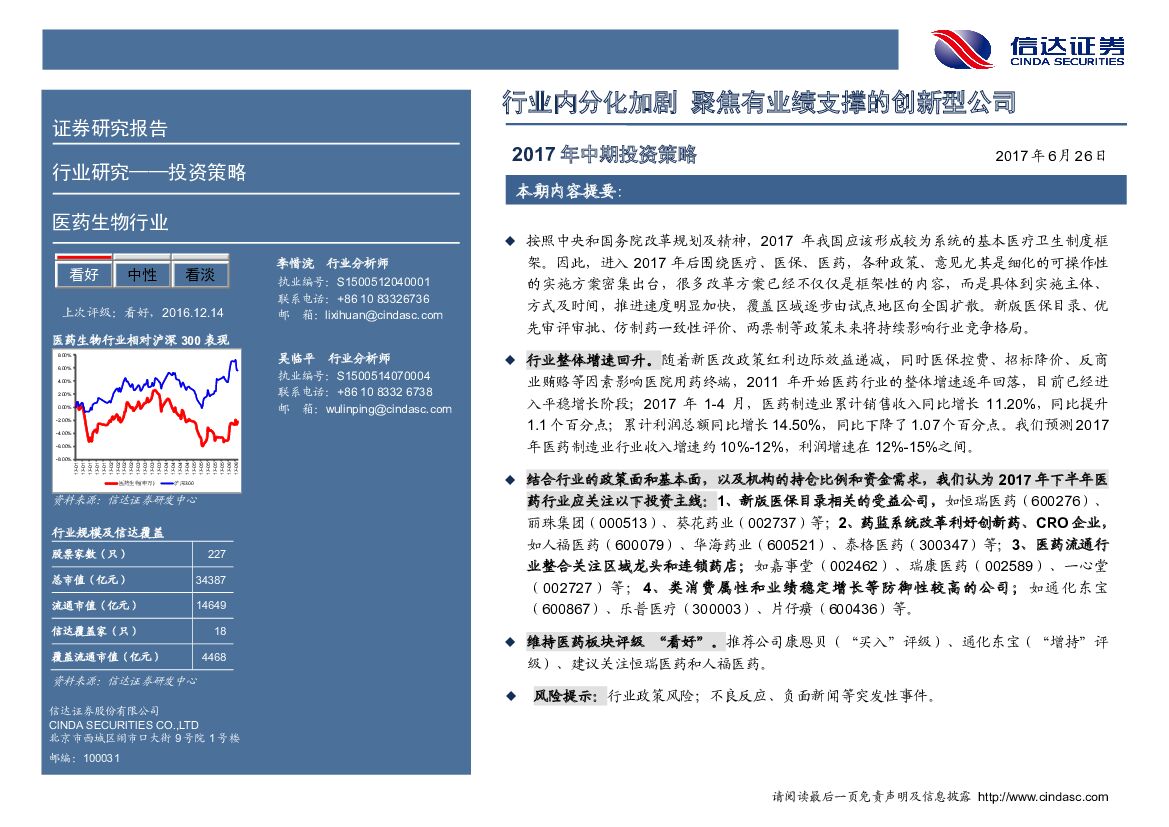 信达证券:医药生物行业2017年中期投资策略:行业内分化加剧 聚焦有业绩支撑的创新型公司.pdf
