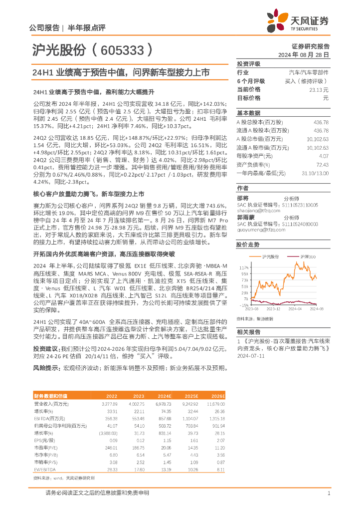 天风证券:沪光股份(605333)-24H1业绩高于预告中值,问界新车型接力上市.pdf