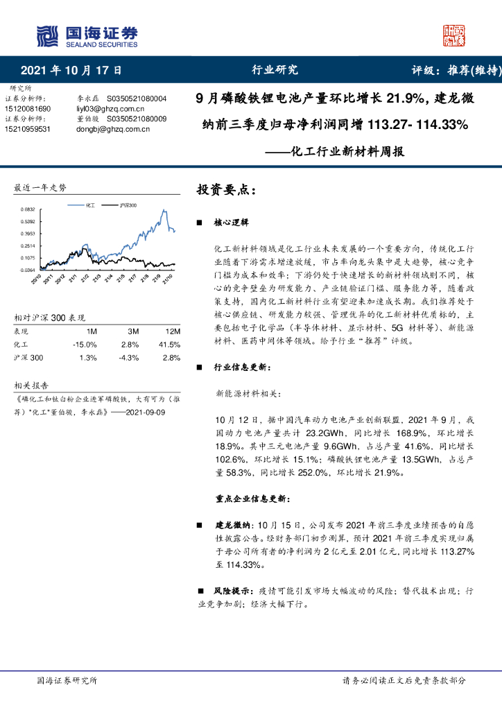 国海证券:化工行业新材料周报:9月磷酸铁锂电池产量环比增长21.9%,建龙微纳前三季度归母净利润同增113.27-114.33%.pdf