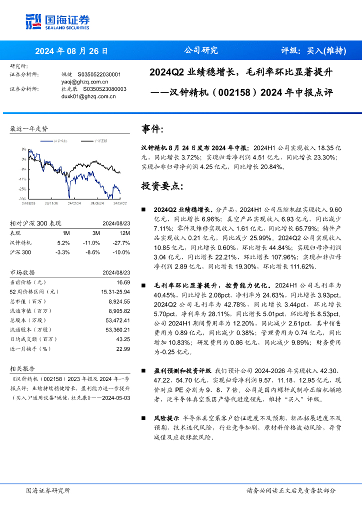 国海证券:汉钟精机(002158)-2024年中报点评:2024Q2业绩稳增长,毛利率环比显著提升.pdf