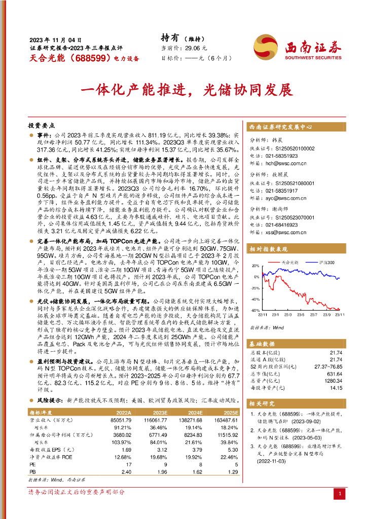 西南证券:天合光能(688599)-2023年三季报点评:一体化产能推进,光储协同发展.pdf