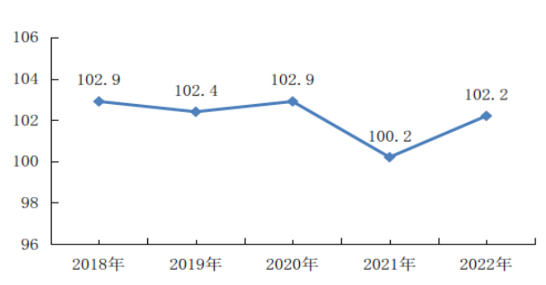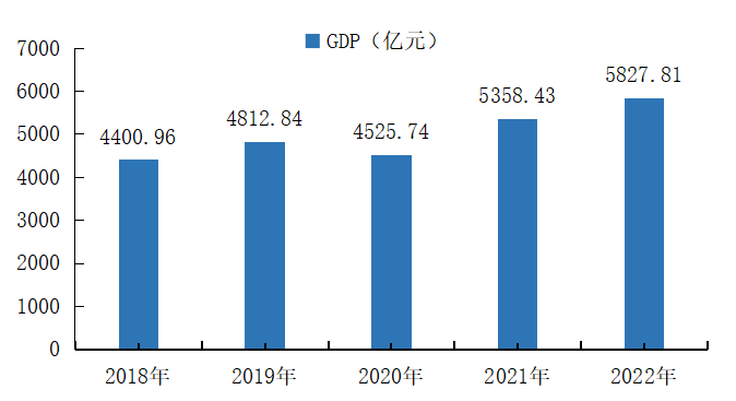初步核算,2022年全市地区生产总值(GDP)5827.81亿元,跨越5800亿元台阶,按不变价格计算,比上年增长5.4%。其中,第一产业增加值605.61亿元,增长4.4%;第二产业增加值2734.56亿元,增长9.5%;第三产业增加值2487.64亿元,增长1.7%。三次产业结构由2021年核实后的10.3∶45.3∶44.4调整为10.4∶46.9∶42.7。人均地区生产总值11.1万元,突破11万元大关。