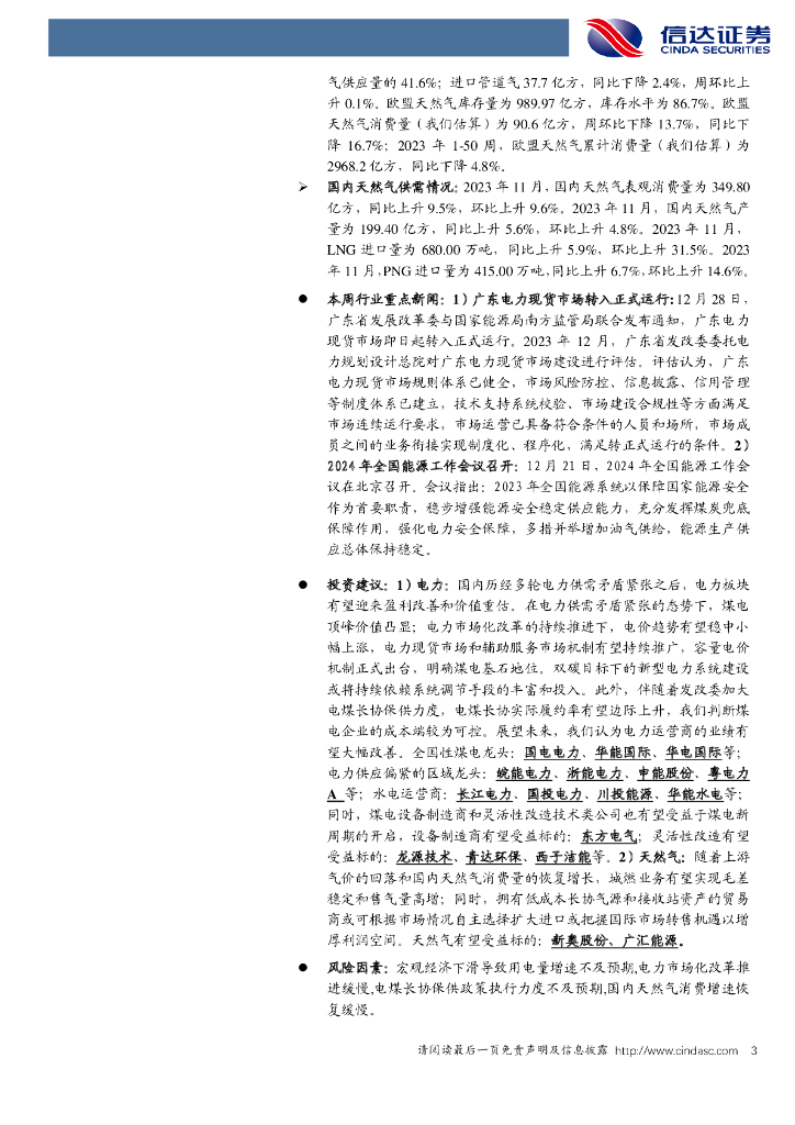 信达证券:公用事业—电力天然气周报:广东电力现货市场转入正式运行,11月我国天然气表观消费量同比增长9.5%.pdf