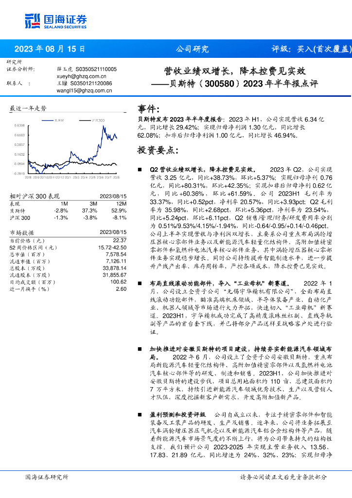 国海证券:贝斯特(300580)-2023年半年报点评:营收业绩双增长,降本控费见实效.pdf