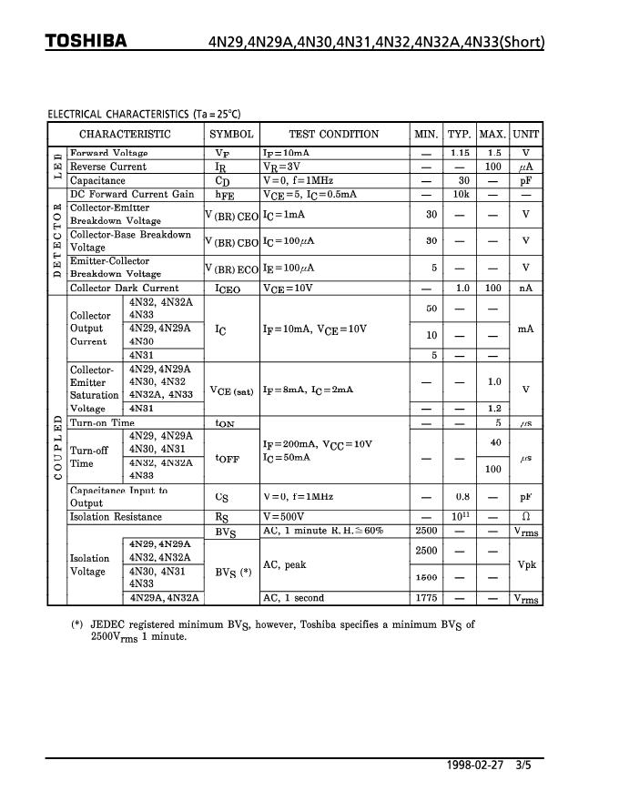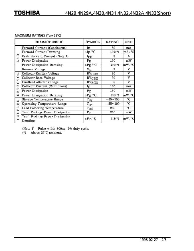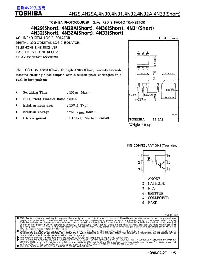 TOSHIBA 4N29, 4N29A, 4N30, 4N31, 4N32, 4N32A, 4N33(Short) 数据手册.pdf