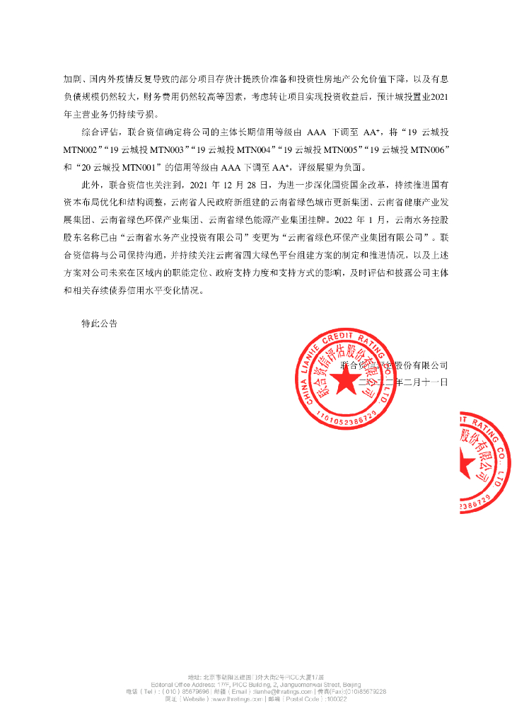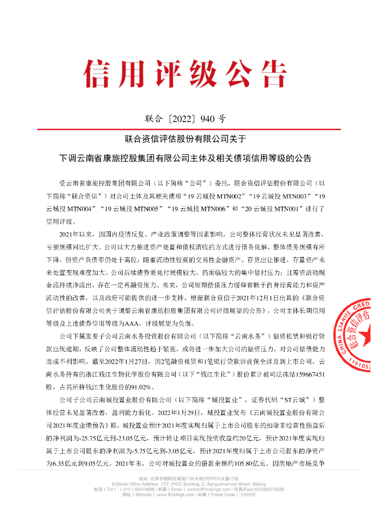联合资信:联合资信评估股份有限公司关于下调云南省康旅控股集团有限公司主体及相关债项信用等级的公告.pdf