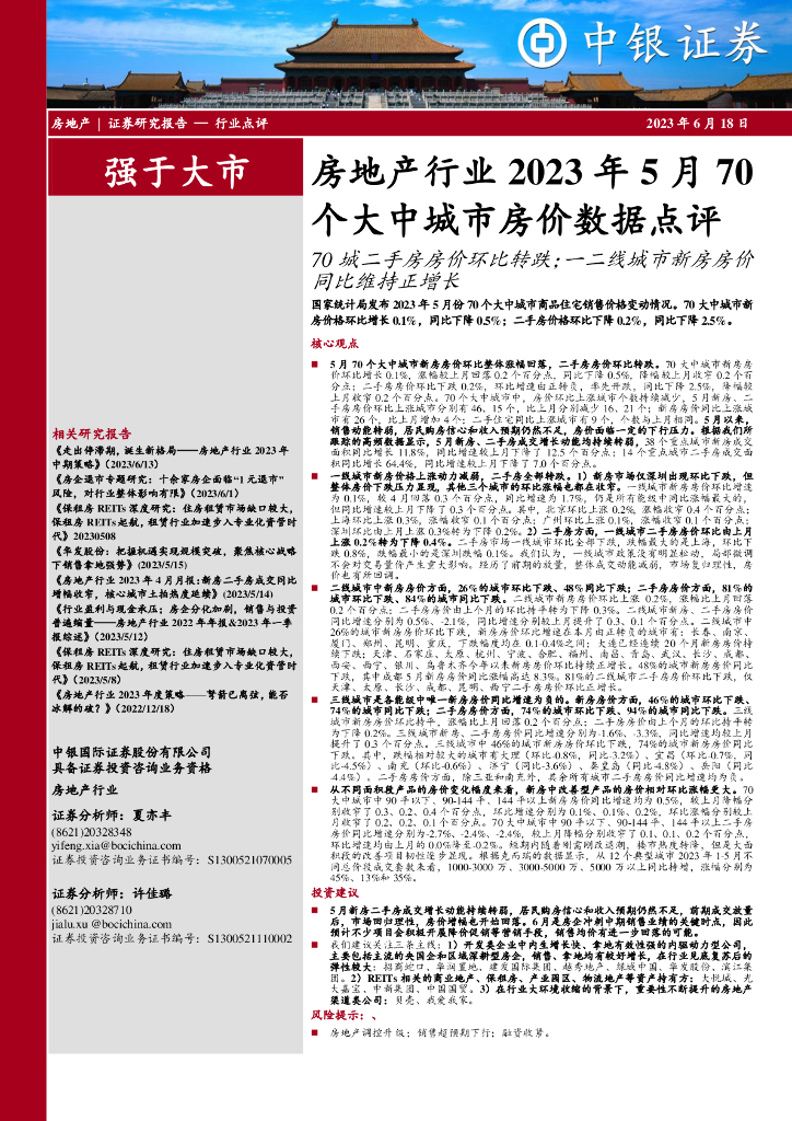 中银证券:房地产行业2023年5月70个大中城市房价数据点评:70城二手房房价环比转跌;一二线城市新房房价同比维持正增长.pdf