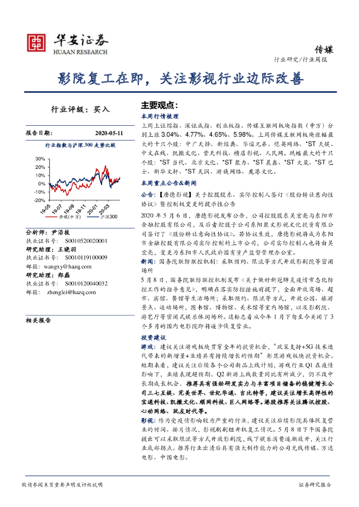 华安证券:传媒行业周报:影院复工在即,关注影视行业边际改善.pdf