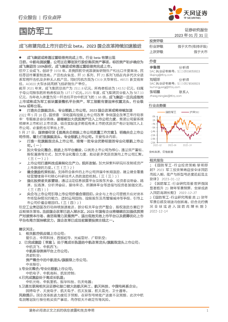 天风证券:国防军工:成飞有望完成上市开启行业beta,2023国企改革持续加速推进.pdf