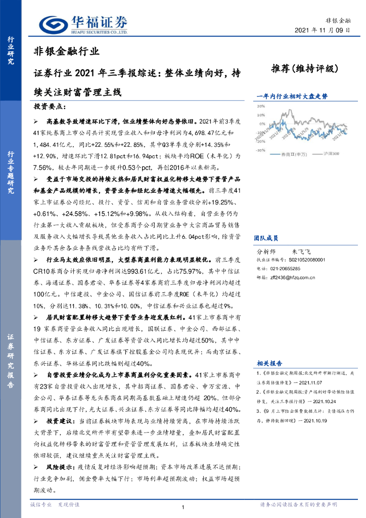 华福证券:证券行业2021年三季报综述:整体业绩向好,持续关注财富管理主线.pdf