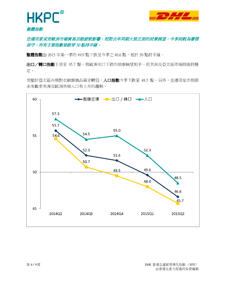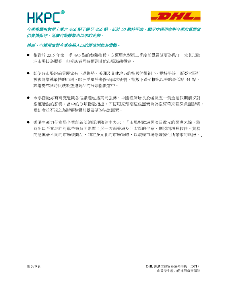 香港生产力促进局:2015年第二季度DHL香港空运贸易领先指数(DTI)报告(繁体版).pdf