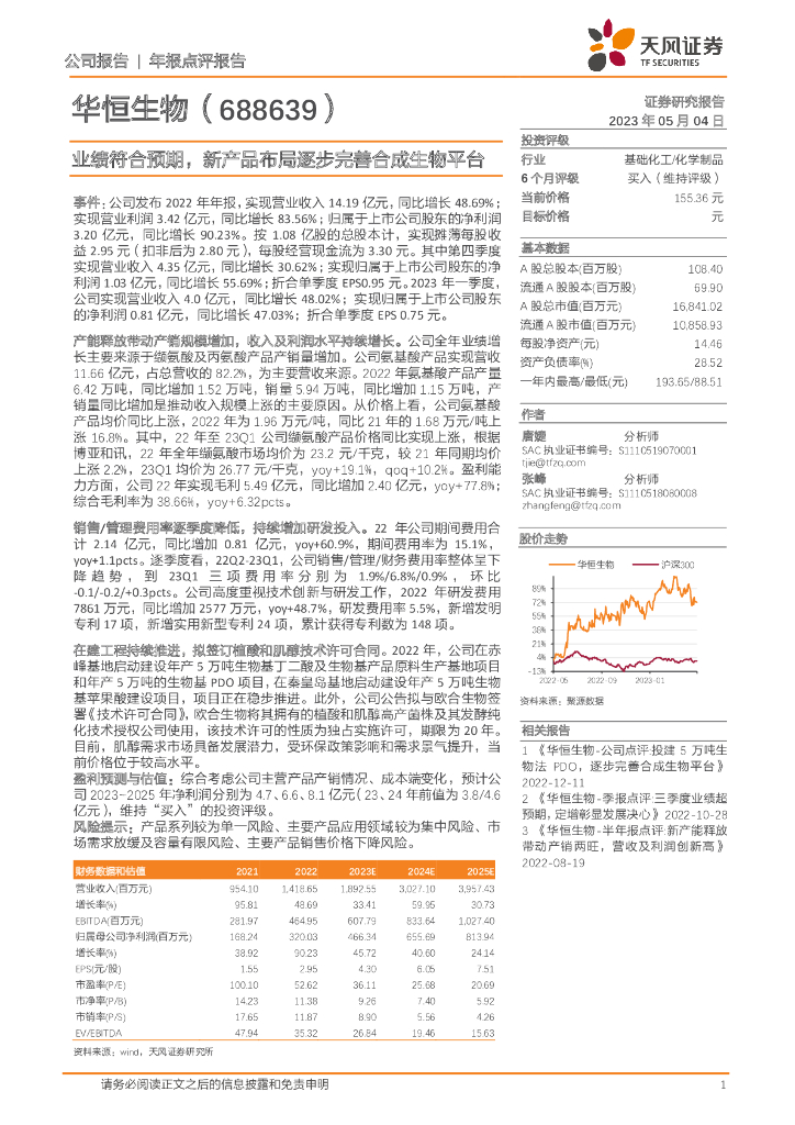 天风证券:华恒生物(688639)-业绩符合预期,新产品布局逐步完善合成生物平台.pdf