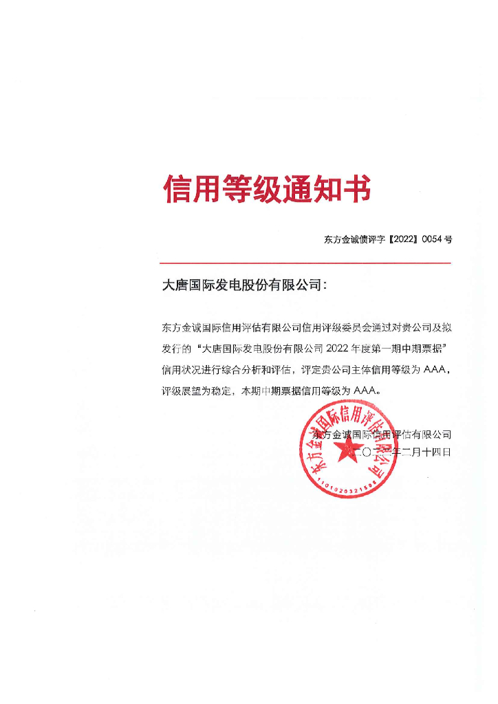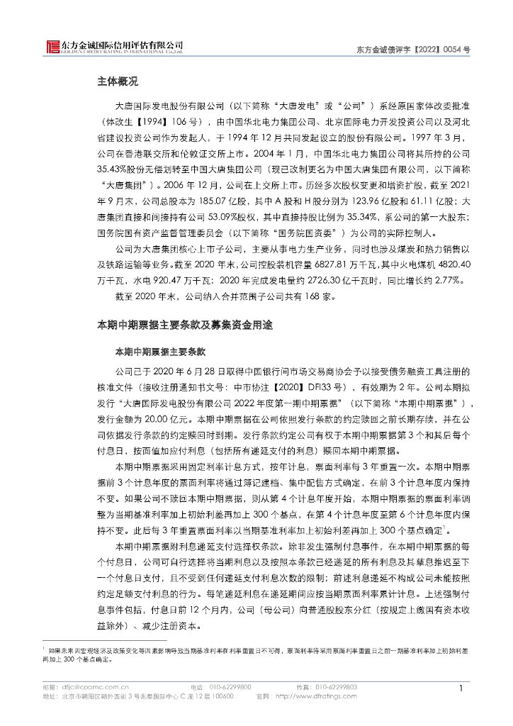 东方金诚:大唐国际发电股份有限公司2022年度第一期中期票据信用评级报告.pdf