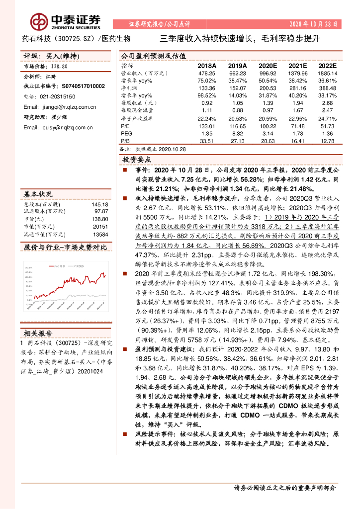 中泰证券:药石科技(300725)-三季度收入持续快速增长,毛利率稳步提升.pdf