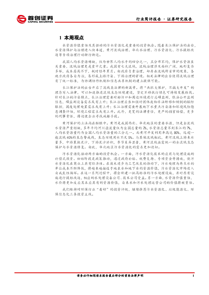 首创证券:环保行业简评报告:污水资源化渐行渐近.pdf