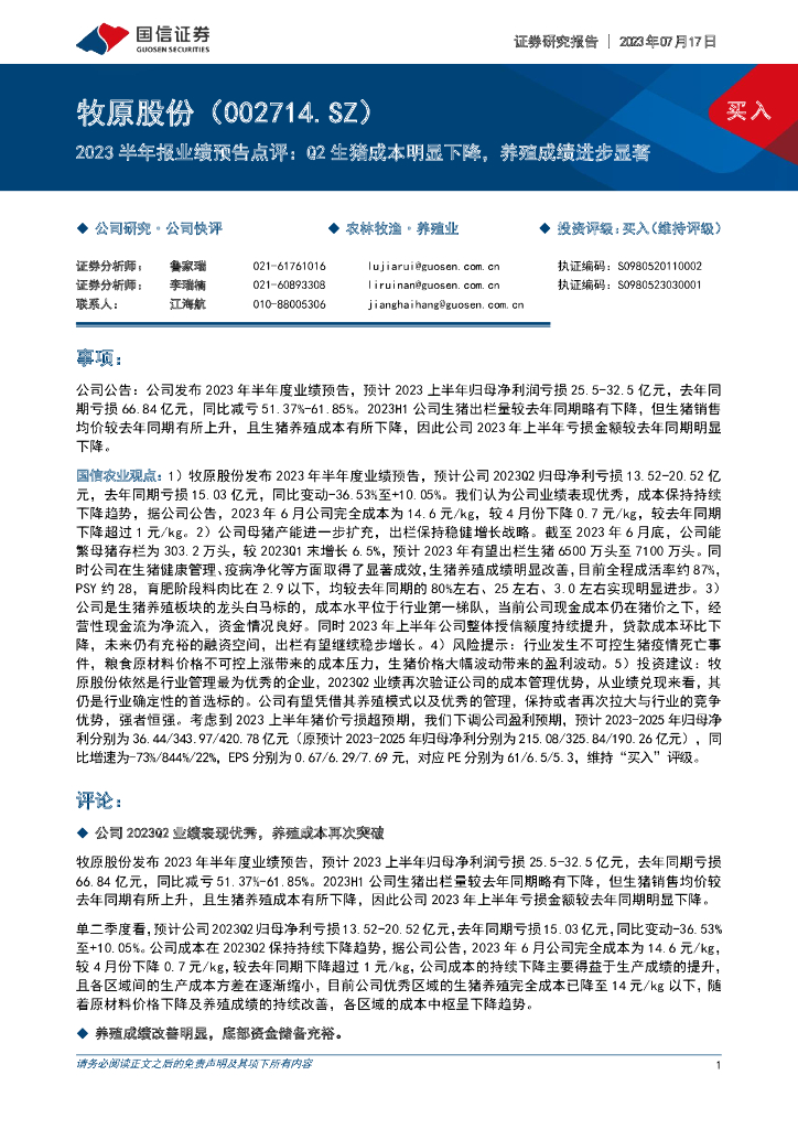国信证券:牧原股份(002714)-2023半年报业绩预告点评:Q2生猪成本明显下降,养殖成绩进步显著.pdf