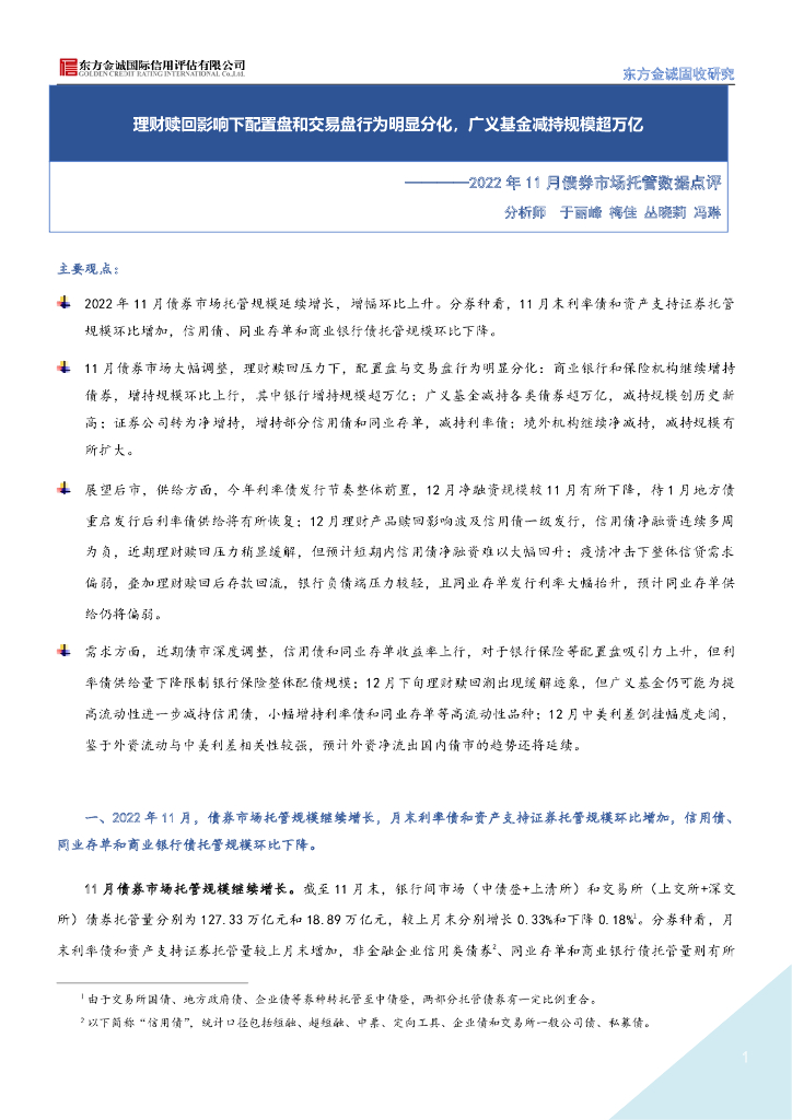 东方金诚:理财赎回影响下配置盘和交易盘行为明显分化,广义基金减持规模超万亿-2022年11月债券市场托管数据点评.pdf