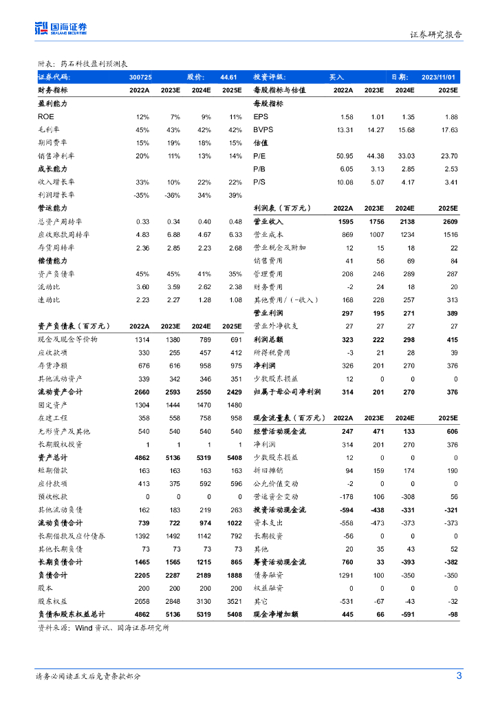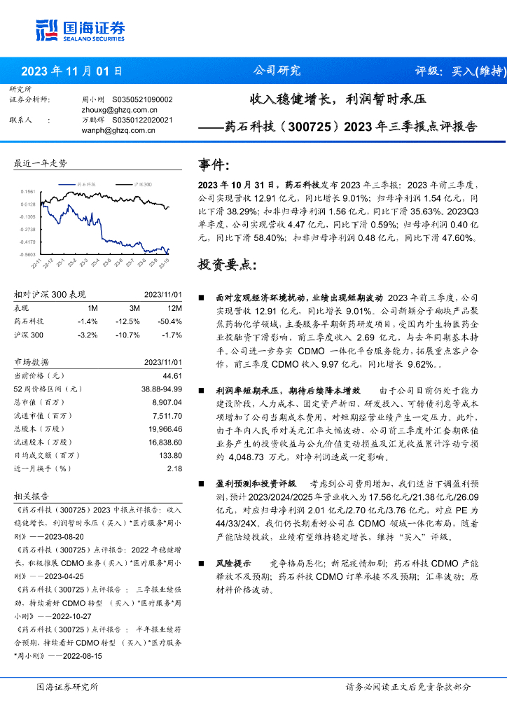 国海证券:药石科技(300725)-2023年三季报点评报告:收入稳健增长,利润暂时承压.pdf