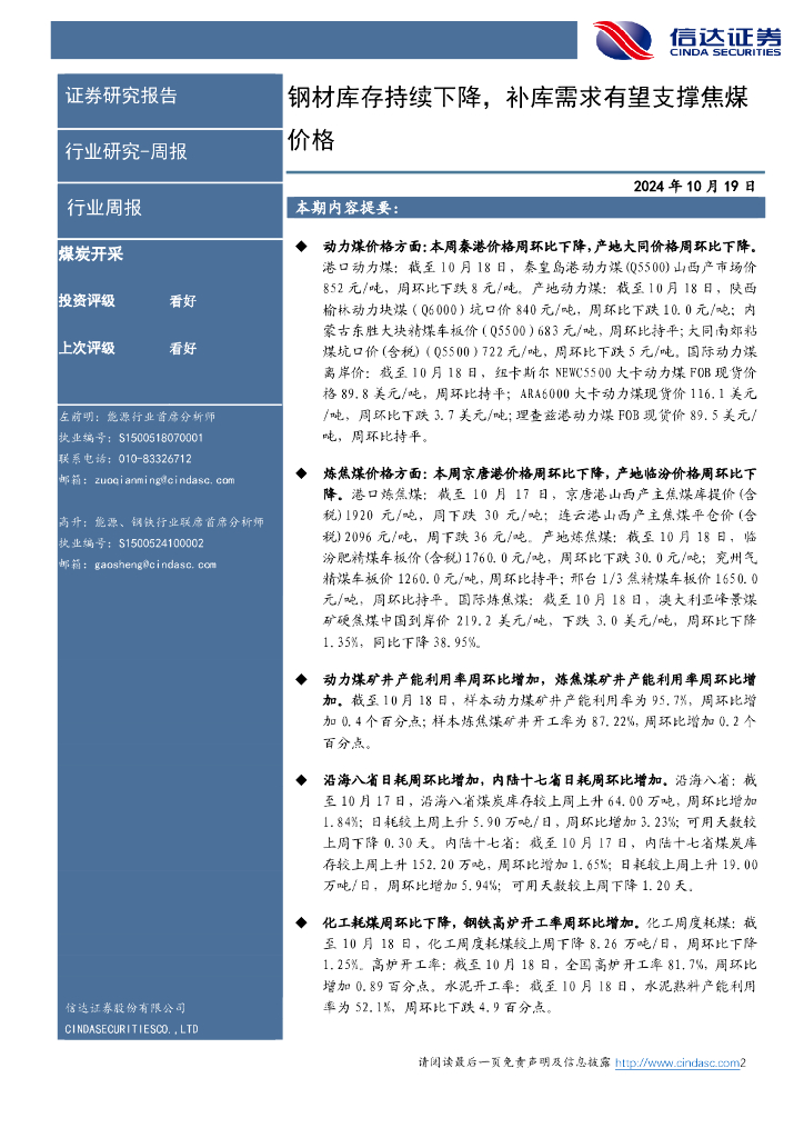 信达证券:钢材库存持续下降,补库需求有望支撑焦煤价格.pdf