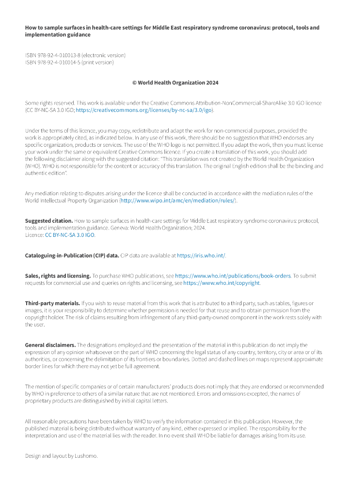 WHO世界卫生组织:2024年如何在医疗机构中对表面进行中东呼吸综合征冠状病毒采样方案、工具和实施指南报告(英文版).pdf