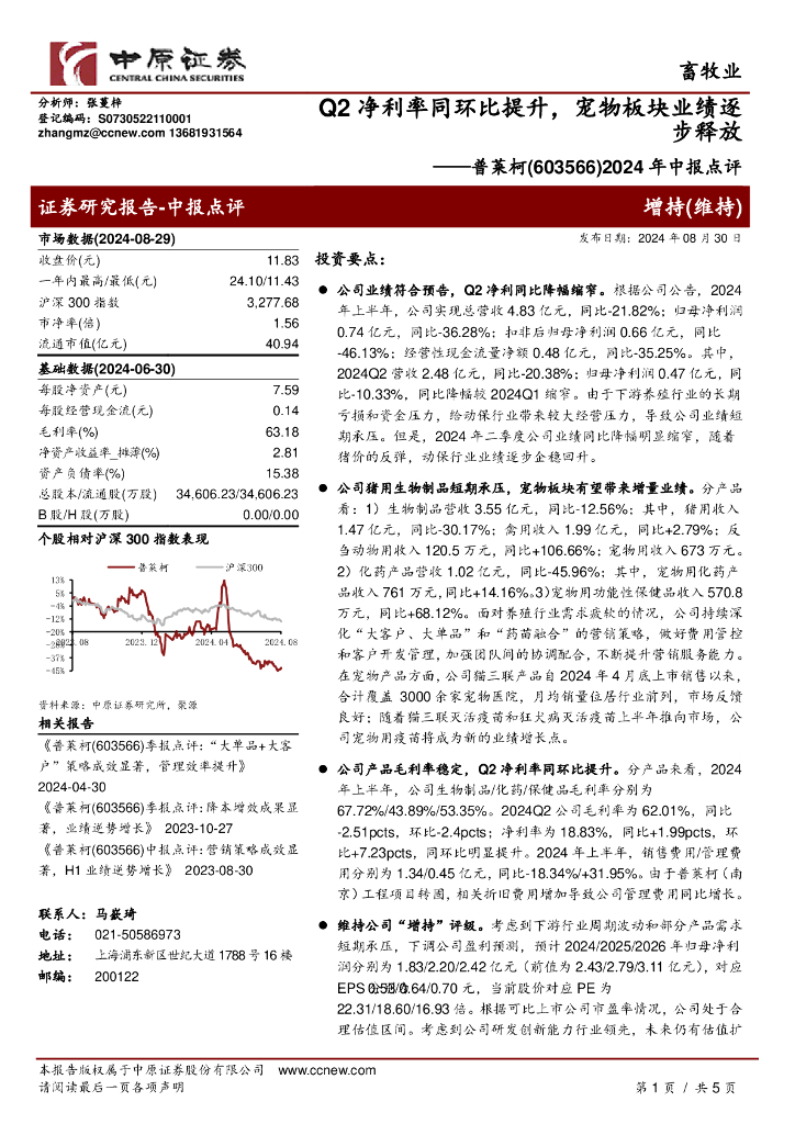 中原证券:普莱柯(603566)-2024年中报点评:Q2净利率同环比提升,宠物板块业绩逐步释放.pdf