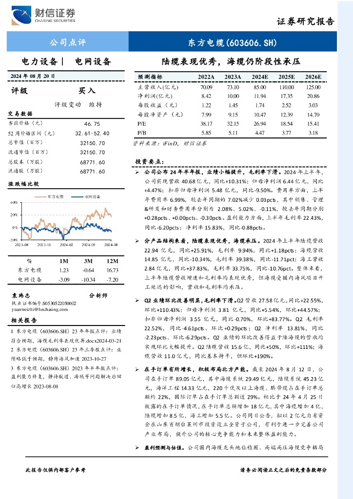 财信证券:东方电缆(603606)-陆缆表现优秀,海缆仍阶段性承压.pdf