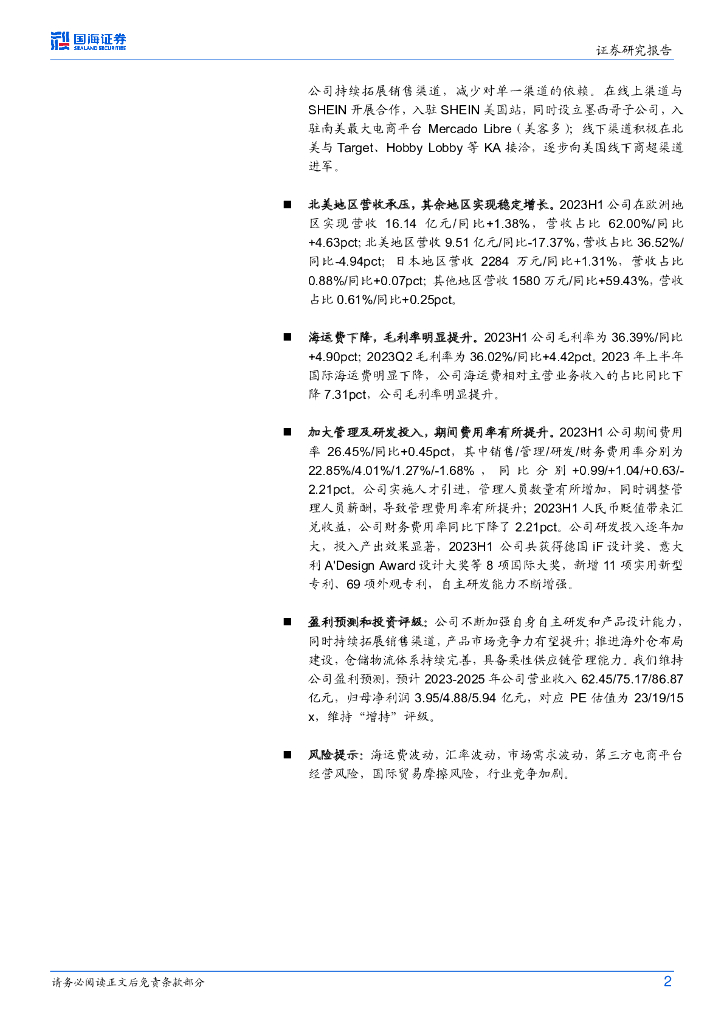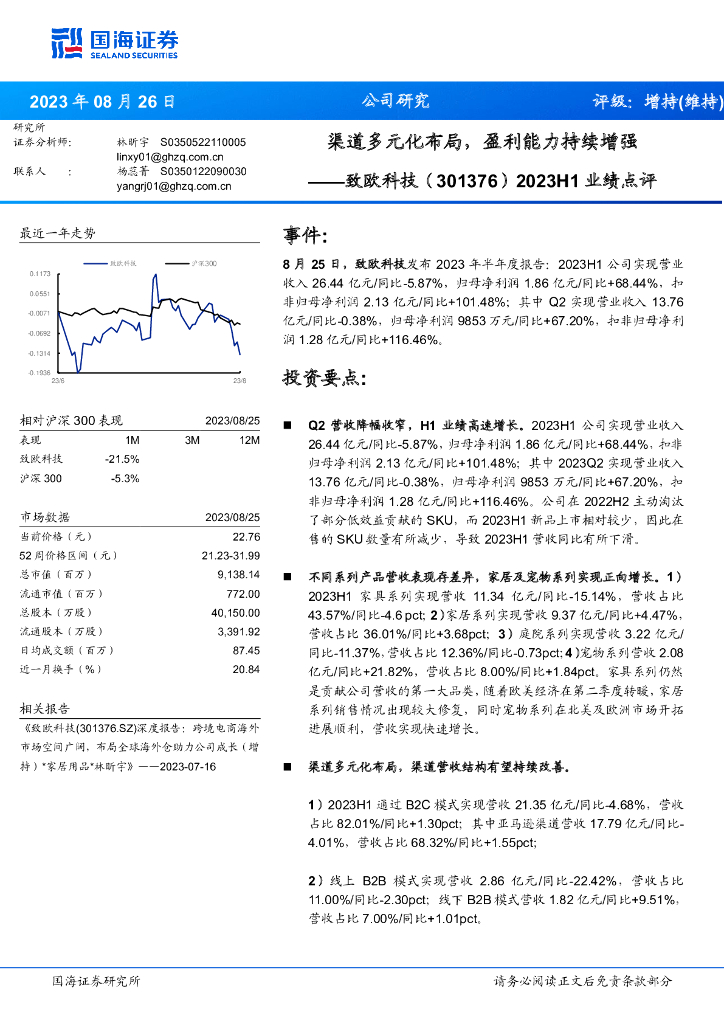 国海证券:致欧科技(301376)-2023H1业绩点评:渠道多元化布局,盈利能力持续增强.pdf